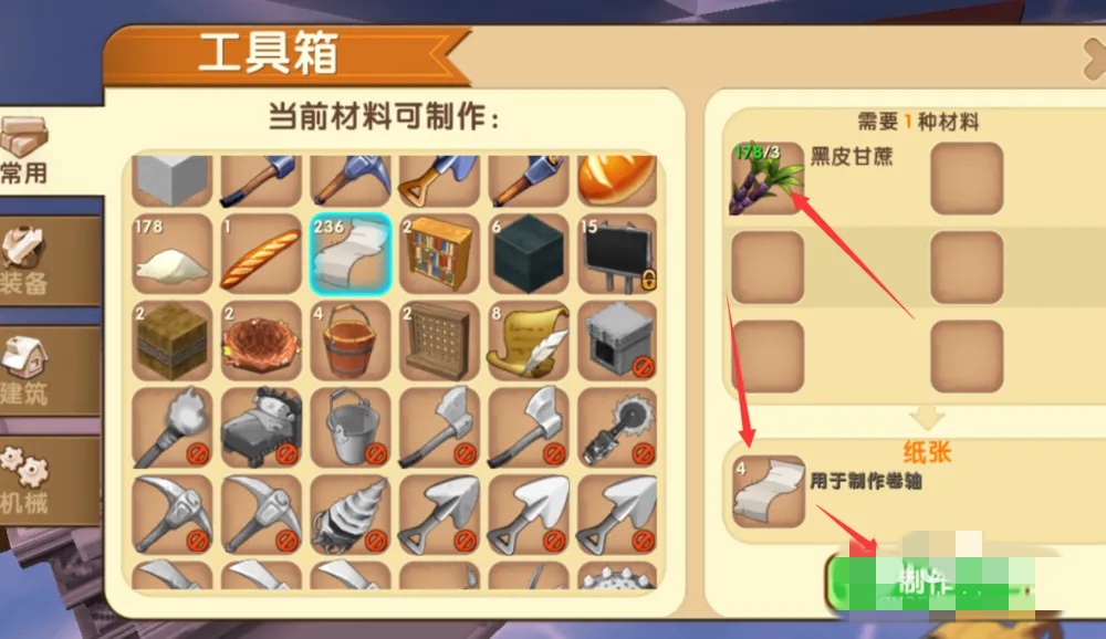 当然,除了随机附魔,还有指向性附魔,就是先把无限射击的附魔弄出来,然后给弄到弓上。这样我们先需要一些纸,纸通过甘蔗合成。