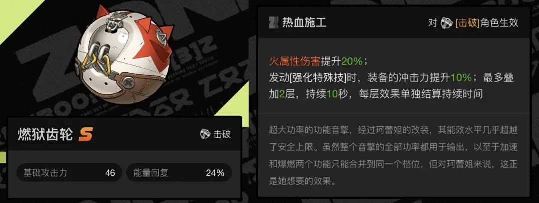 音擎效果提供20%的火伤加成和可叠2层的强化特殊技后10%冲击力加成,是比较泛用的击破音擎,是珂蕾妲的专武,狼哥使用也不错。