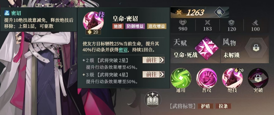 这层密诏如同战神的庇护,能提升10点绝技战意减免,让队友在关键时刻更具韧性,释放绝技后,密诏效果虽会移除,但其带来的优势却已在战斗中发挥了至关重要的作用,随着蹇硕在游戏中的成长与突破,他的绝技也不断得到升华,2星突破时,提升行动条效果增至45%,让队友的行动更加迅速,4星突破时,这一效果更是达到了50%,使蹇硕的辅助能力上升的空间更多了。