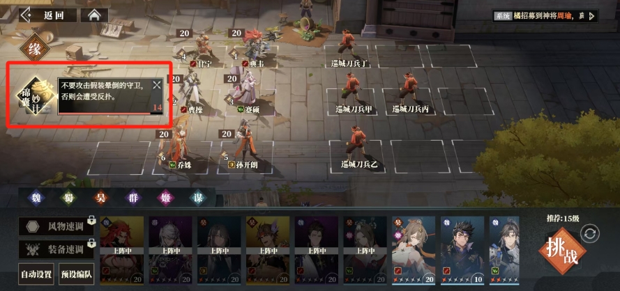 其实在一开始大家参与关卡的时候就会有提示,告知玩家不要攻击假装晕倒的守卫,否则敌人会进行反扑,这是一个重要的信息,因为一旦触发敌人的反扑,可能会使战斗变得更加困难,所以玩家在战斗过程中要仔细观察战场情况,识别出那些可能会触发反扑的单位,这里大家面对的敌人就是巡城刀兵丁,这些兵丁的技能有着独特的效果。
