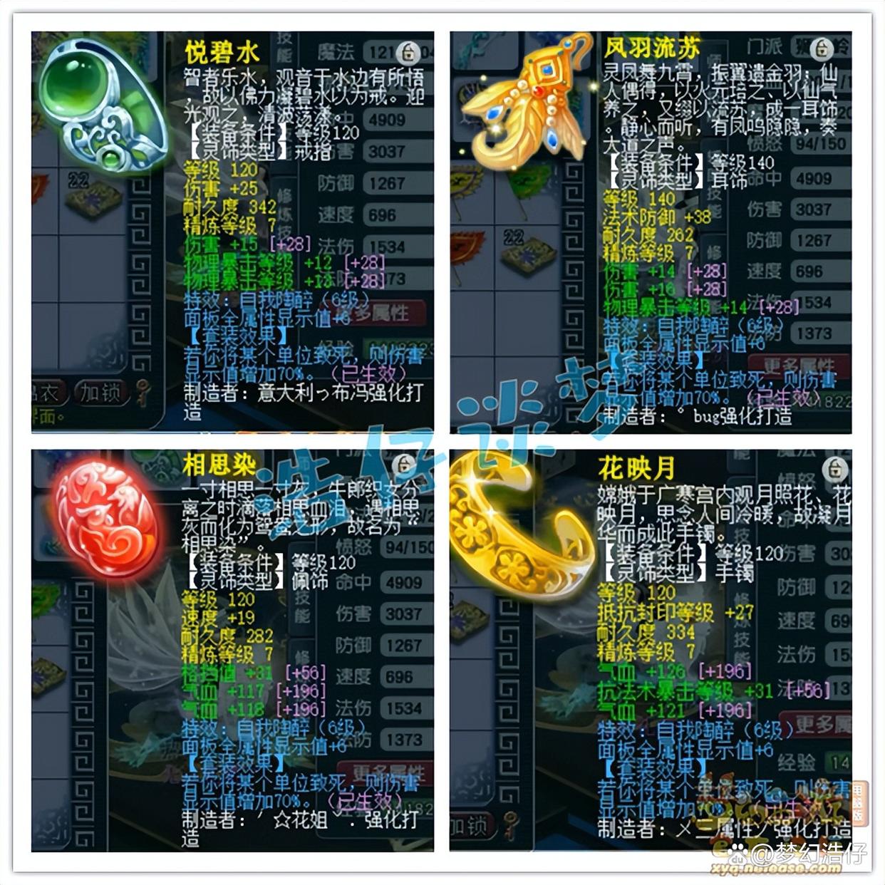 戒指下排双物暴一伤害,耳饰下排双伤害一物暴,佩饰下排双气血一格挡,手镯下排双气血一抗法暴,特效选择了6级自我陶醉,看来他给自己的定位就是高端任务号!