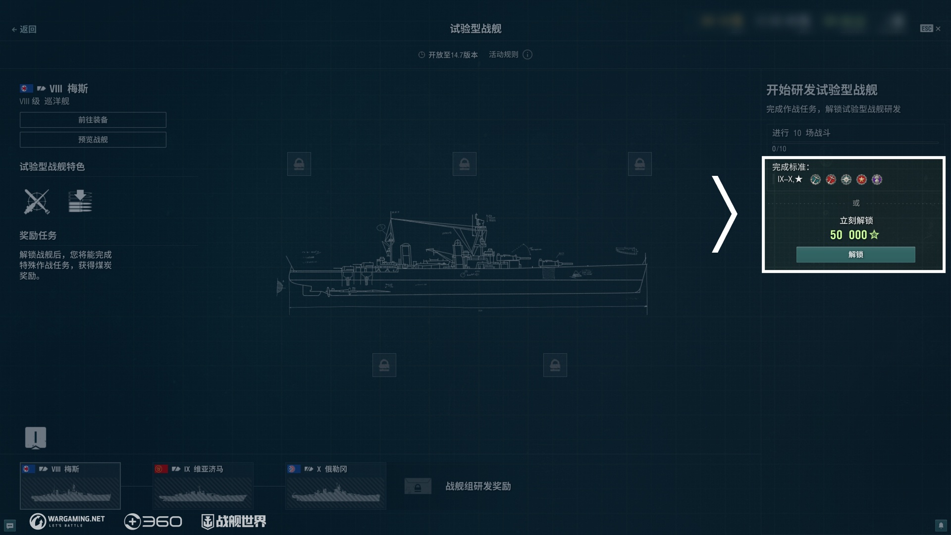由于试验型战舰主要是为熟练玩家设计的,因此您需要完成一项特殊任务才能解锁战舰研发。任务完成条件如下:在除军团战和战斗训练之外的任意战斗类型中,使用IX-X级战舰和超级战舰完成10场战斗。或者,您也可以花费50000全局经验立即解锁研究权限。