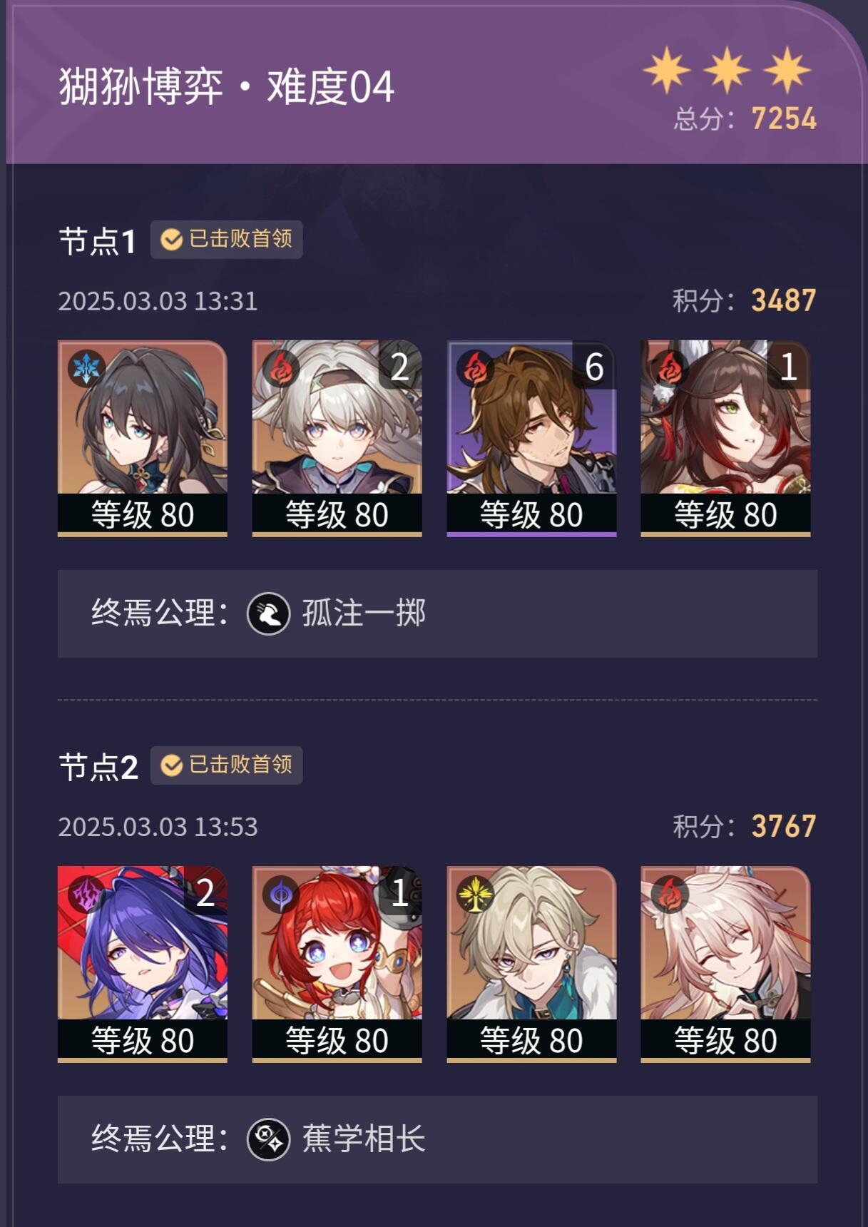 上半开始的时候用的黄泉队(带10缇宝),下半用的流萤超击破,不过分数不太理想,差不多刚过线一点点。上下半阵容反过来后则好打很多,拿了7254分。