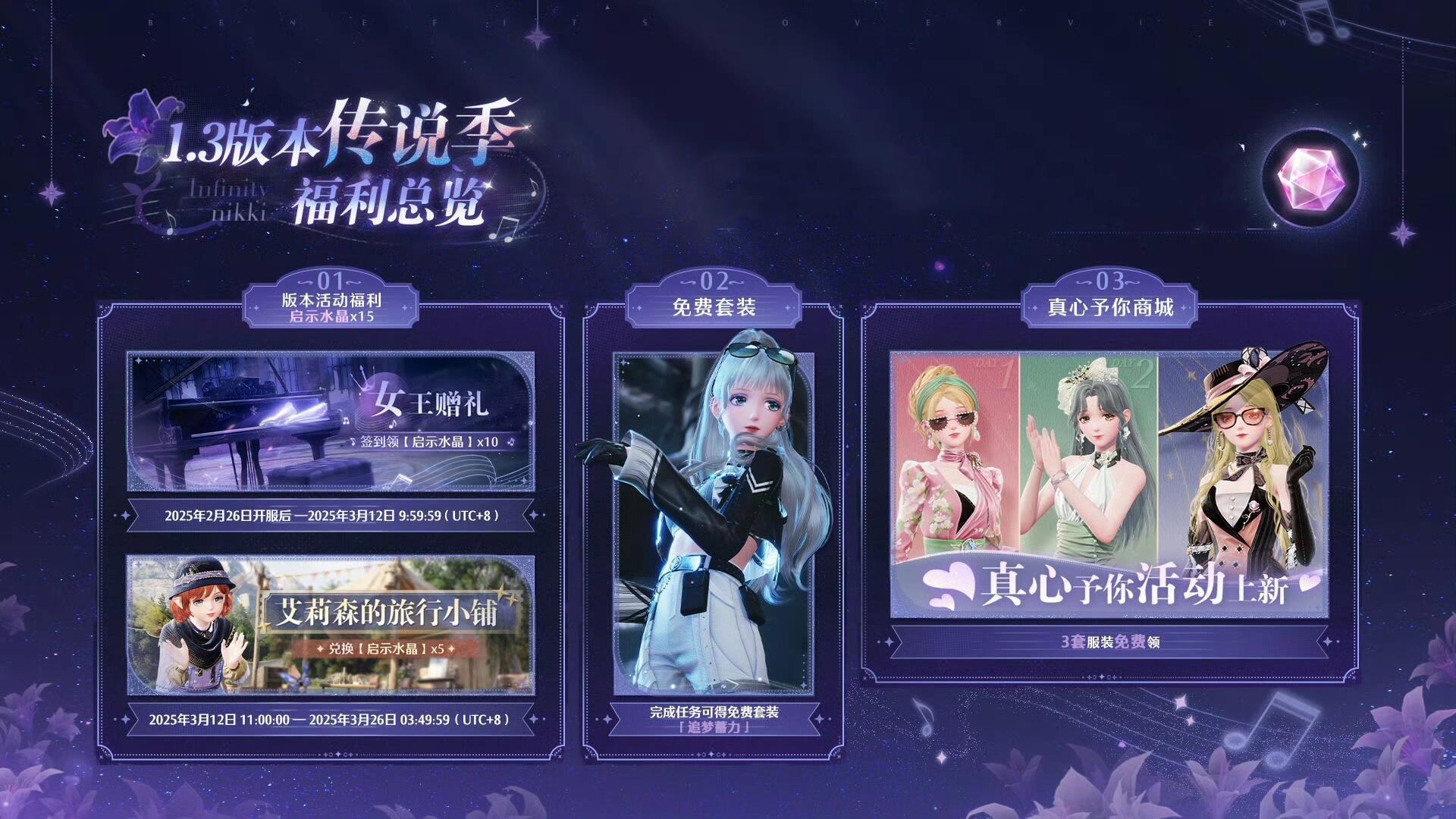 无限暖暖1.3版本传说级福利汇总来了,可得启示水晶*15,以及领取4套免费套装!此外参与1.3各类版本活动,还可以解锁共鸣水品、专属名片背景称号等丰厚奖励,额外还可获得2500+钻石。