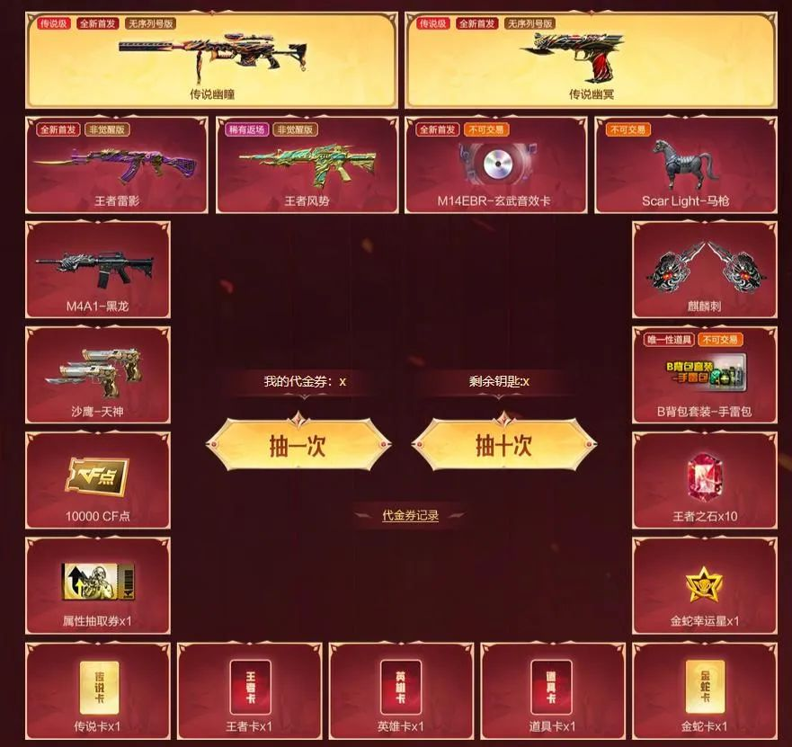 传说幽瞳、传说幽冥、王者雷影、王者风势、M14EBR-玄武音效卡、ScarLight-马枪、M4A1-黑龙、麒麟刺、沙鹰-天神、B背包套装-手雷包、10000CF点、王者之石x10、属性抽取券x1、金蛇幸运星x1、传说卡x1、王者卡x1、英雄卡x1、道具卡x1、金蛇卡x1