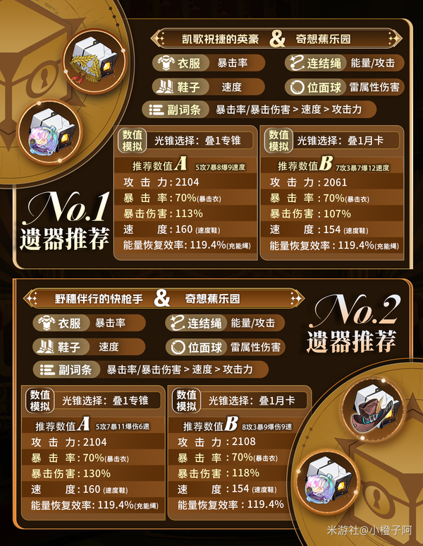 ① 外圈遗器最契合的就是【凯歌祝捷的英豪】,二件套提供攻击加成,四件套提供速度加成,其中忆灵能够吃到攻击与爆伤加成。