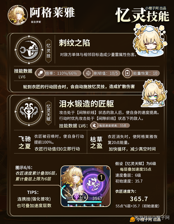 ◇技能加点:忆灵天赋(6)=忆灵技(6)=天赋(10)=普攻(6)=终结技(10)>战技(8+)阿格莱雅大多数技能都挺重要的,除了战技之外技能都影响到了阿格莱雅与衣匠的输出,而战技就稍微次要一些了,毕竟升级只是增加衣匠的生命值,可在其他技能点满后再将其点高或者点满。