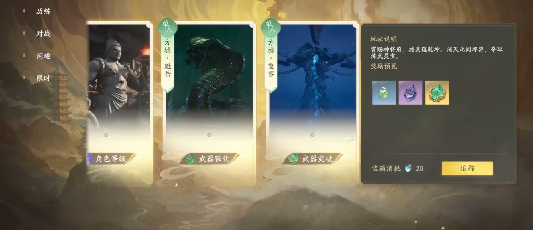 首先大家在主页面中打开秘境选项,然后在其中选择修行,就可以看到有一系列副本类型,这里面所进行的大多数都是单人副本。方墟重黎也是其中之一,它所掉落的主要道具都是用于武器突破的,击败里面的怪物后就可以获得练武灵宝。主要掉落养成材料耀光琉晶,百炼精魄,揽风晶魄等。