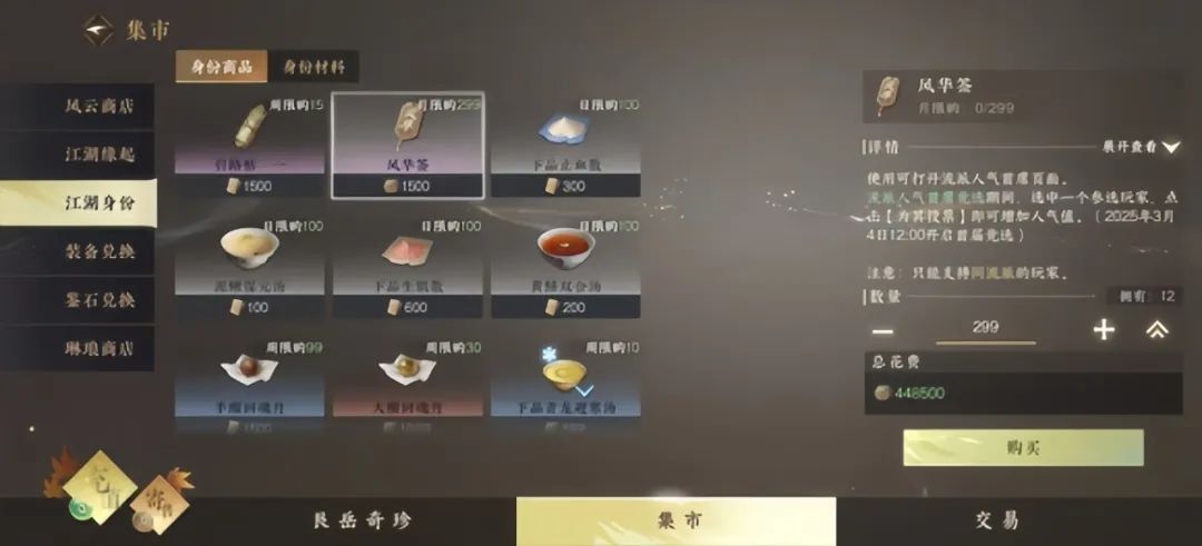 最新竞选机制引发热议:人气票开放交易后,实力较量转变为资本博弈。紫禁之巅服务器人气票黑市价达1元/张,部分工作室甚至推出包揽首席的套餐服务——10亿铜币+70万风华签的豪华竞选方案。玩家锐评:"与其说是流派首席,不如说是财富排行。铜币到位,首席就位。"
