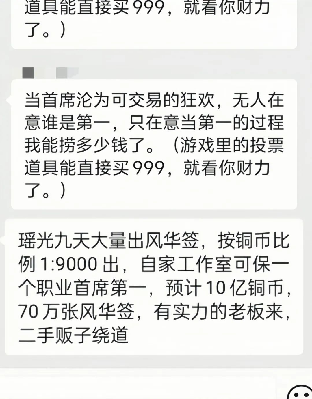这场竞选形成独特经济链:1. 金主玩家:通过收购人气票冲击首席宝座2. 普通玩家:出售小号资源获取收益3. 工作室:承接大额订单赚取差价有玩家算过经济账:清空小号资源可获得约220元收益,而冲击首席需投入超40万元。部分玩家建议将这种"货币回收机制"常态化,认为此举能有效活跃游戏经济。