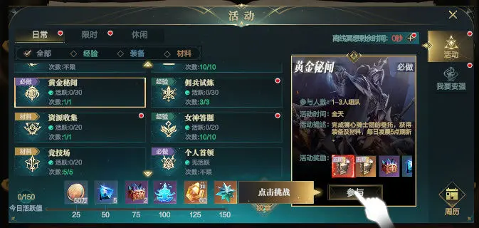 其次是限时任务,该任务的难度适中,能帮助新手小伙伴快速的提高等级,并且还能获得经验,金币,宝石等等的奖励。挑战任务也可以积极的参与,这里可以挂机进行,对角色的属性加成有帮助,同时也有很多实用的强化道具,装备等,任务的难度低,很适合新手小伙伴去做。 首领挑战等到大家的等级达到要求后就会开启,而且每提升5级,就有新的首领任务开启,这里的奖励非常的丰厚,还有高阶装备,红色装备等的奖励。