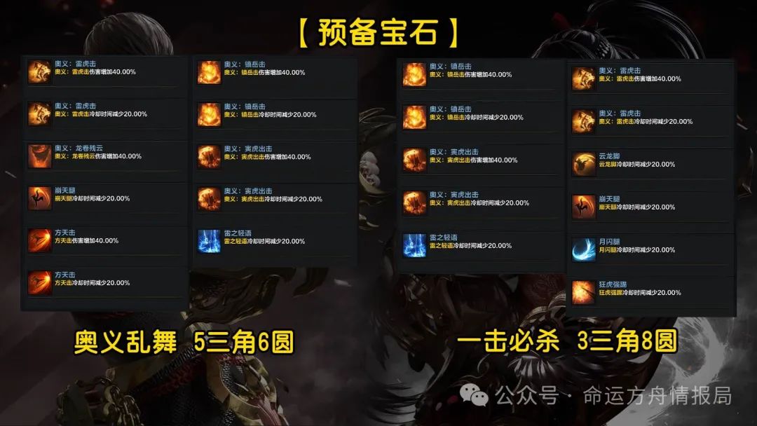 建议预先配置对应职业宝石并储备银币用于宝石洗练。奥义乱舞需配置5级三角宝石与6级圆形宝石,一击必杀流派则需3级三角宝石与8级圆形宝石