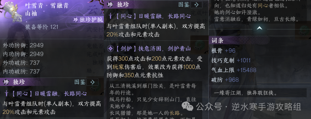 场景适配:单人副本中激活组队增益效果显著。PVE环境下300攻击+200元素攻击的组合适合元素流派与治疗系素心职业,后者可替换姜却头形成三青鸟手镯+雪融袖的套装搭配。PVP受击防御强化特性契合铁衣、素问职业,碎梦在独珍套装中可替代雀隐护腕。