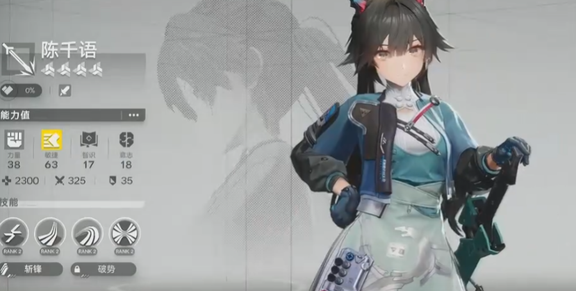 陈千语有着超高的武艺和乐观的性格,不管是身处什么样的环境,经历了什么样的遭遇,她都会坚持自我,永不退缩,她的主动技在释放以后会立刻闪现到敌人的身边,对其打出200%的物理伤害,同时敌人还会遭受到1秒的击飞,如果这位目标此时正好处于破韧状态中,那么还会有30%的几率生成结晶能量,她的终结技在四方后会先将敌人给击飞,随后对其展开八次斩击,每一次斩击都会让敌人承受攻击力为70%的物理伤害,并且第一次斩击会给敌人添加伤韧效果。