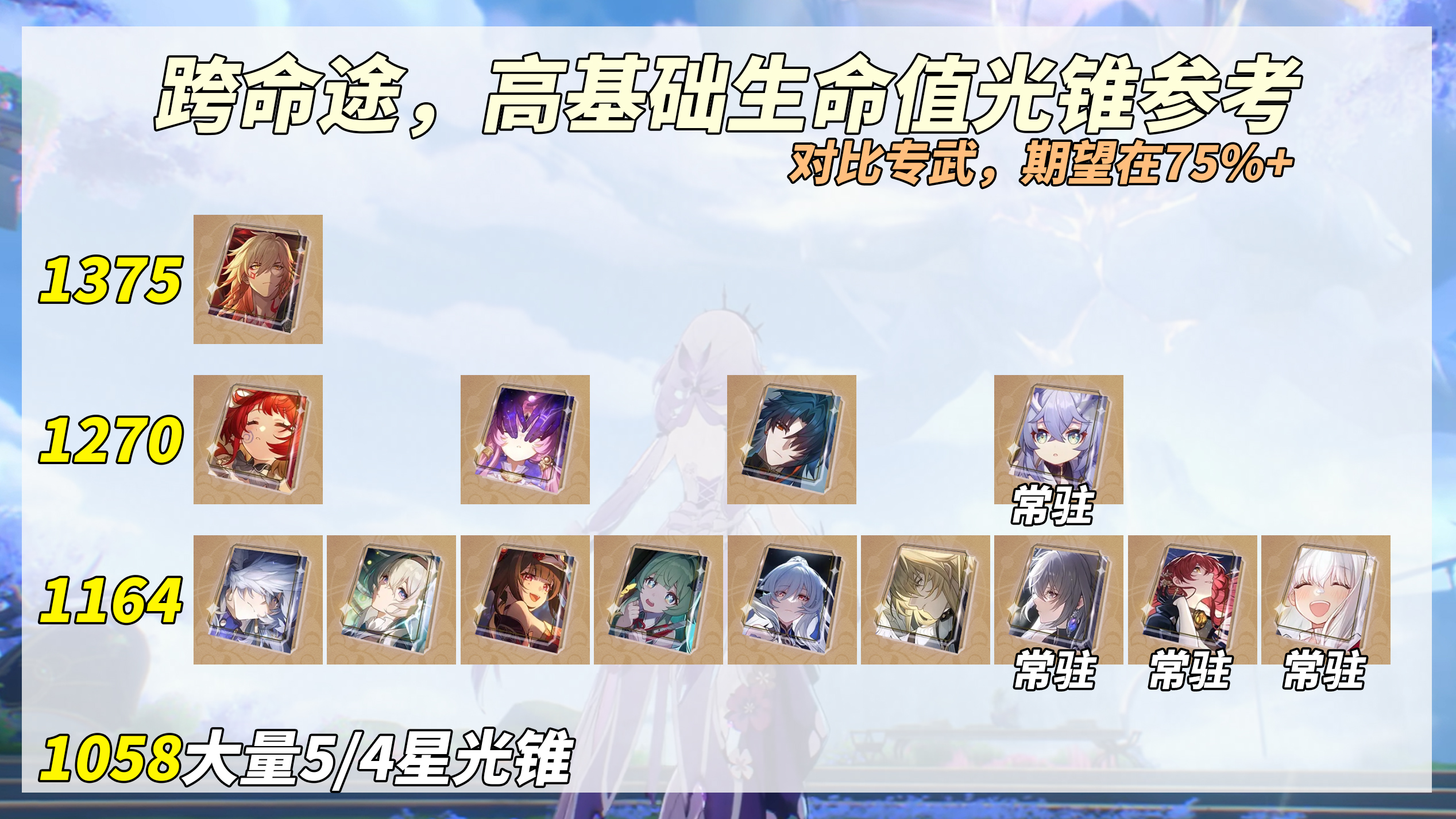 替代装备推荐体系:1.大月卡装备「多流汗少流泪」可提供75 - 80%的专武等效输出,需持续5个版本投入2.跨命途高生命装备如「血火啊燃烧前路」「如果时间是一朵花」等,基础生命值在1270 - 1375区间的装备均可作为过渡选择