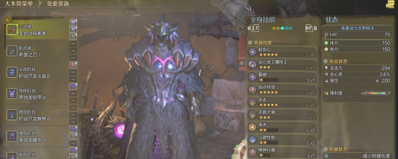 这套配装经过实测可以稳定触发紫斩状态,配合精准的防御斩与升龙击使用,在对付棘龙、天彗龙等弱龙目标的时候能够达成两分台狩猎记录哦。建议根据护石质量来调整攻击守势与翔虫使的等级配比。
