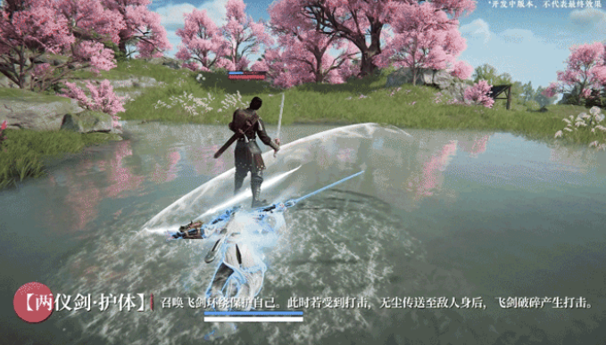 第二个技能【两仪剑•护体】让无尘的防守能力再上一层楼。这招能召唤出五把两仪剑,为自己提供短暂的保护,进入霸体状态。而如果在护体期间被敌人攻击,无尘不仅能免疫这次伤害,还能瞬间传送到敌人身后进行反击!敌人还没反应过来,就已被无尘的剑气吞噬。
