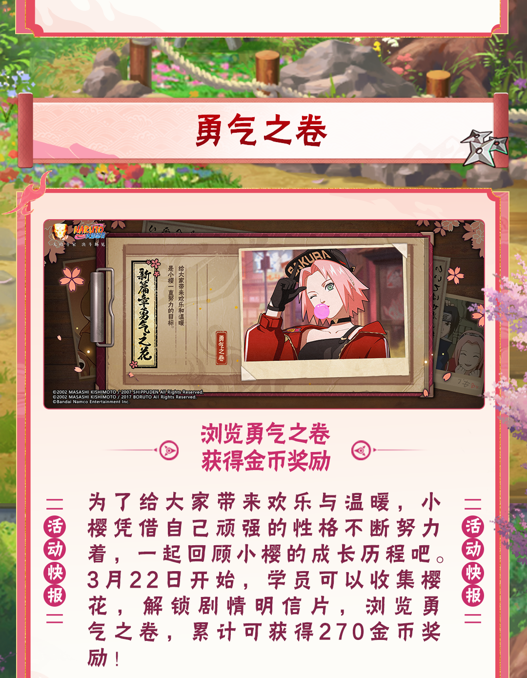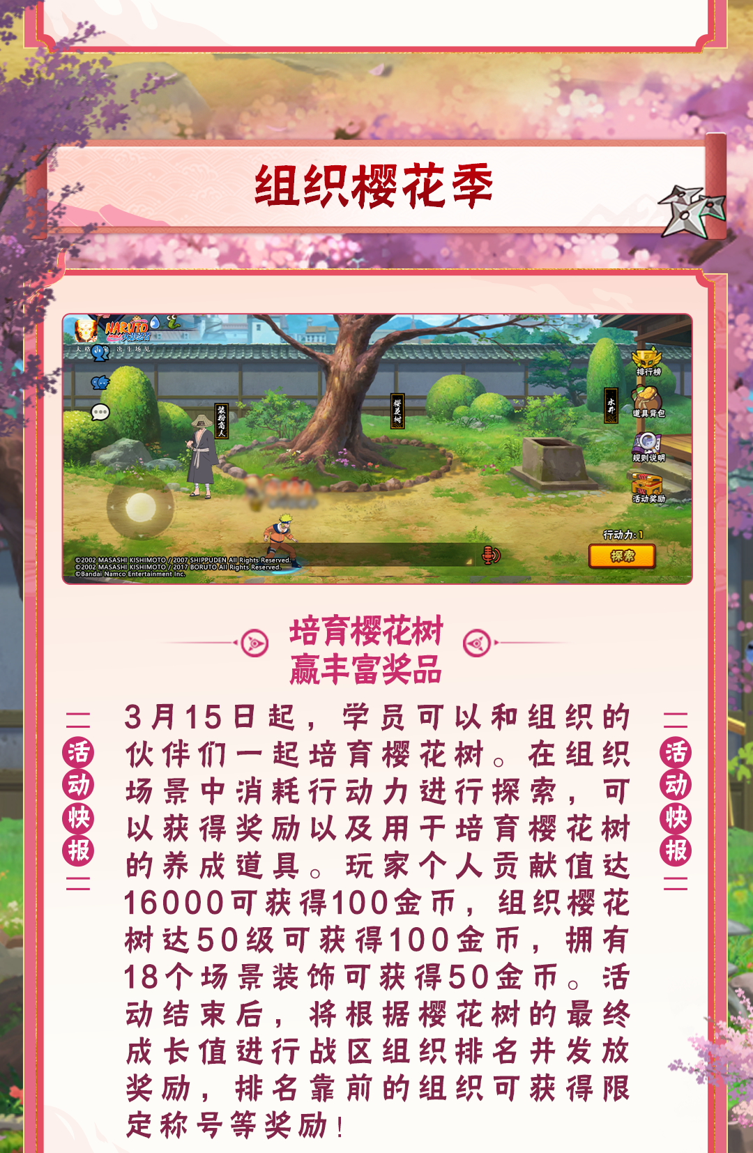 花见任务线:完成剧情章节就能解锁新场景,每章通关奖励包含3000忍币和5张赏花券。