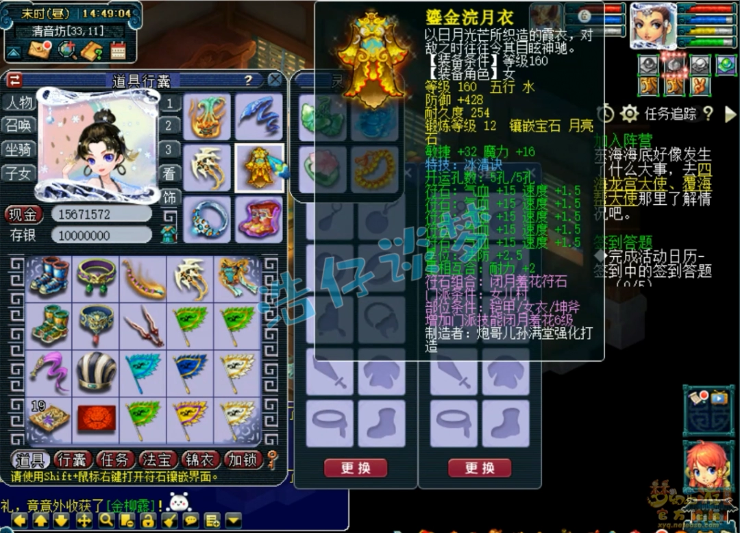 铠甲是160级的冰清诀装备,敏魔双加了48点,同样用12级月亮石强化了。