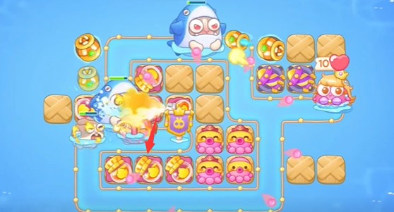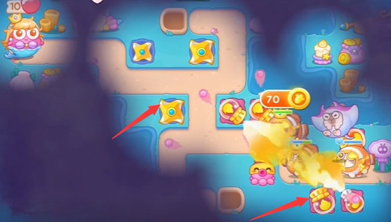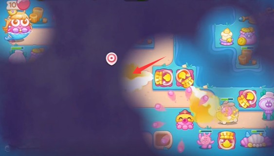 中期在下方火焰塔群旁边放个三连发章鱼炮台,集中清理中央区域的珊瑚礁障碍。