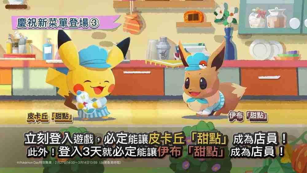 作为庆祝活动的一部分,在活动期间登录游戏的玩家将自动获得甜点皮卡丘作为咖啡师。连续登录三天的玩家还能解锁甜点伊布,让它成为团队的额外成员。