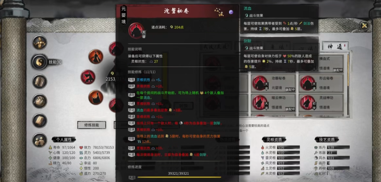 武技:发射额外剑气,场上流血层数大于8层时发射额外剑气,减少冷却时间,降低耗蓝。神功:选择剑神功,词条选择使用身法减少绝技6秒冷却。大法:选择剑大法,词条选择减少绝技冷却时间25%,减少身法冷却时间50%或25%。
