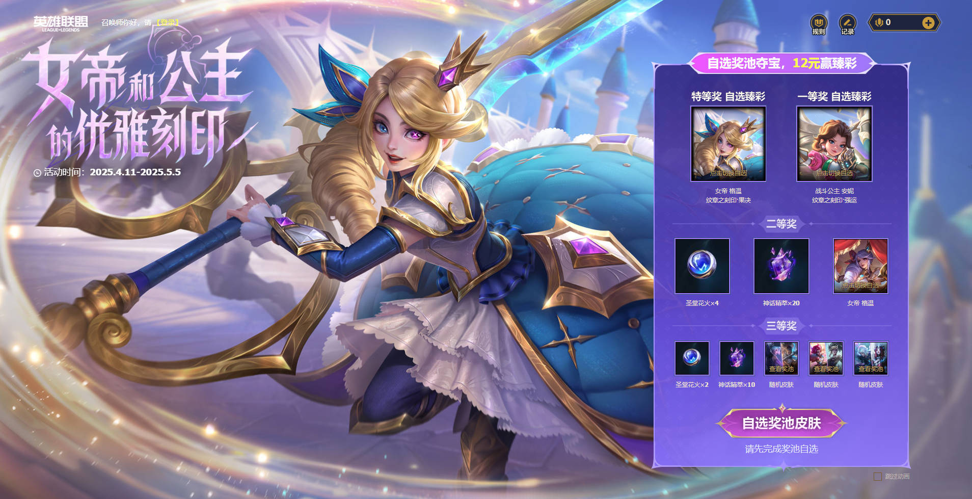 参与方式:在游戏内入口参与。开放周期是4月11日到5月5日,奖励是臻品皮肤自选礼包。