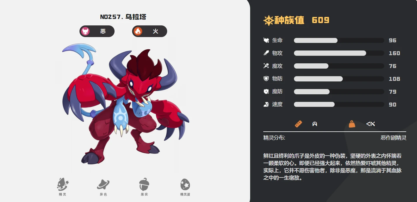 乌拉塔属于恶作剧系精灵,别看它外表凶巴巴的,其实内心可柔软啦。它喜欢用锋利的爪子吓唬别的精灵,但一般情况下,除非碰到恶魔系对手,不然它不会轻易发起攻击。这种特性让它在战斗中能发挥出独特的战术价值。