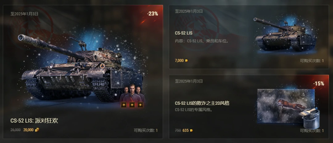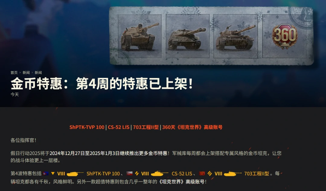 在12月27日到次年1月3日这段时间里,军械库会推出第四周特惠礼包哦。这次上架的三款VIII级金币战车都配备了专属风格涂装呢,指挥官们可以根据自己的作战需求来选择不同的组合方案。
