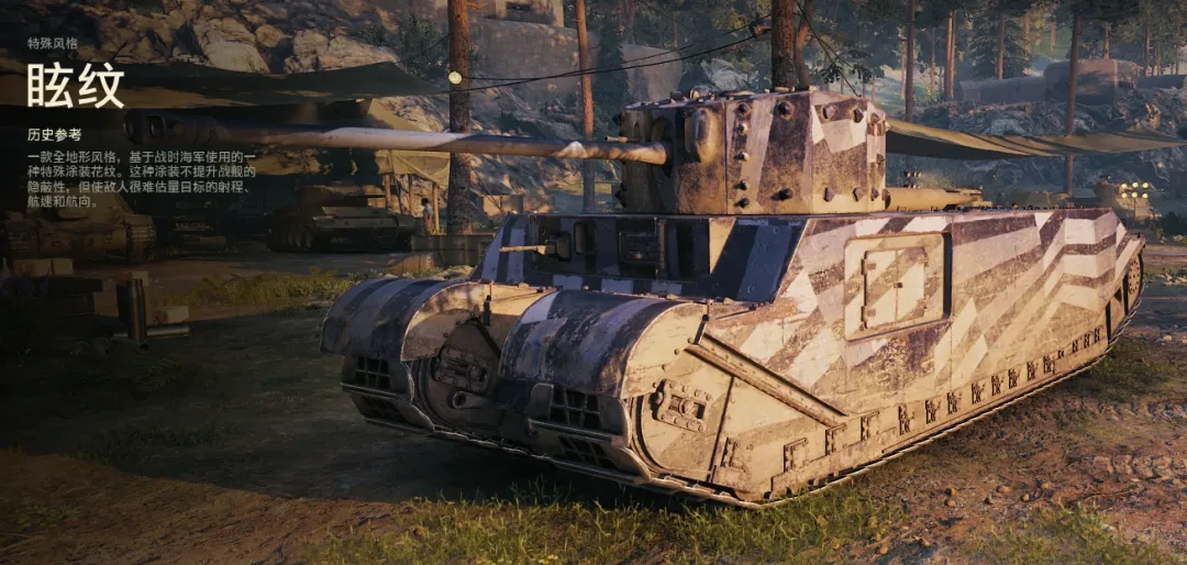 近期推出的KRT - 1战车组合包中会附赠眩纹涂装,其实啊,这个眩纹涂装可以通过两种常规的办法获得:一种是在诺曼底商店消耗15枚令牌去兑换,另一种是通过军械库支付450战争债券来解锁。它的设计原型来源于20世纪10年代应用在海军舰艇上的光学干扰伪装技术。